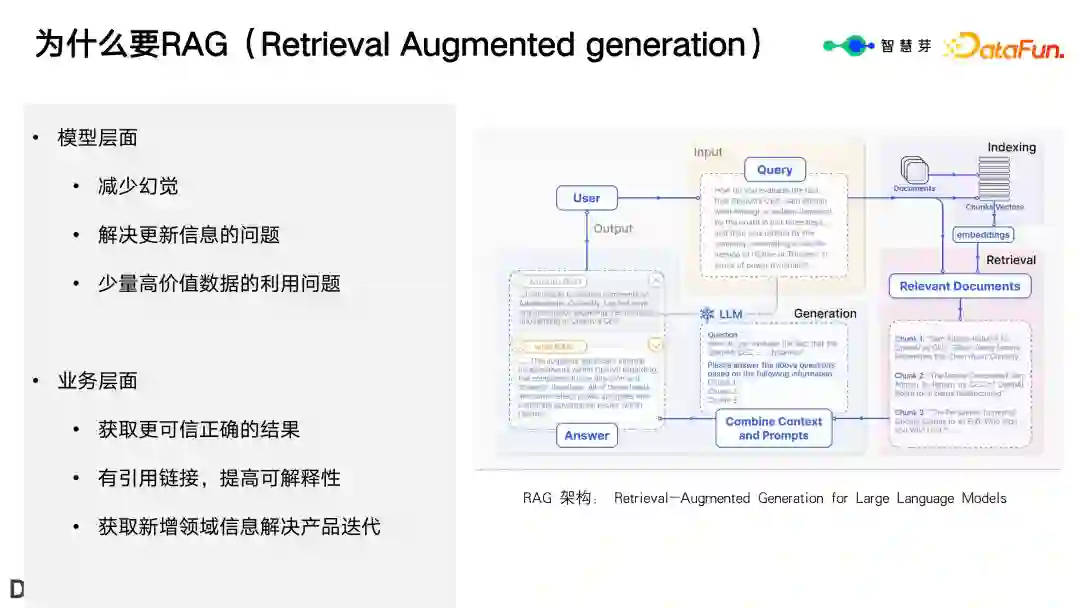 可以从两个方面解释其原因: (1)在模型层面: * 减少幻觉 * 解决信息更新问题。这在产品化过程中至关重要,因为出于成本考虑,模型不可能频繁进行训练,因此数据更新的问题就显得尤为关键。RAG 在工程化或产品化落地上扮演着重要的角色。 * 利用少量高价值数据的问题。这一点尤为重要,在大模型的学习过程中,由于高价值数据量有限,很难学到这些数据,也无法将其放到指令微调中深入学习。在这种情况下,RAG 变得非常关键。