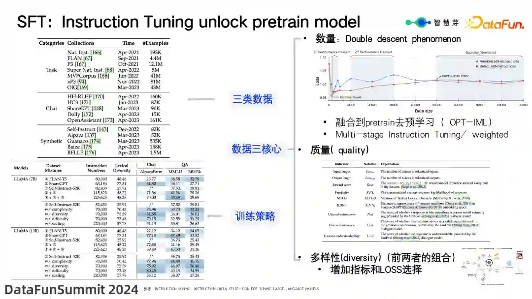 若要提高单个任务的精度,也有许多方法可供选择,例如扩大数据集规模、增强多样性。此外,如果 7B 模型不足以满足需求,可以考虑使用 13B 模型,甚至 70B 模型。 (3)数据三核心:数量、质量和多样性 数量:SFT 训练数据数量的增加存在双降的规律。当数据量为几千条的时候,训练的 loss 会快速下降;随着后续任务的不兼容或产品化需求的提出,数据量会不断增加,此过程中损失也会相应上升。这一问题在智慧芽的实际生产中也经常遇到。以下是几种解决思路: * 将数据融合到预训练中进行预学习(OPT-IML),这实际上是有效的; * 采用多阶段学习而非一次性学习,这也是智慧芽大模型的整体思路,即分阶段进行训练; * 使用数据权重,对 SFT 中不同的数据设置不同的损失权重,对于专家标注的数据,可以设置较大的损失权重,以加快损失的下降速度;对于自动生成或合成的质量较低的数据,可以设置较小的损失权重。
