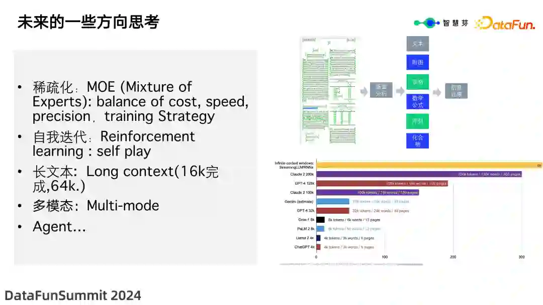 在实践过程中,智慧芽进行了以下思考: * 稀疏化:智慧芽也开发了一个 MoE 模型,除了模型本身,主要目的是平衡成本、速度和精度。随着业务的扩大,成本问题将不可避免地出现。MoE 模型能够更好地平衡性能和使用成本。 * 自我迭代:智慧芽实现了一个强化学习的自我迭代 self play,即自我对话和自我评估,现在也有很多 Self-Rewarding 相关的文章,就是让模型自己和自己对话、评估、迭代,这是一个很好的方向。目前代码已经实现,并初步看到了一些效果,后续将进行更深入的实验。 * 多模态:专利并非只是全文本,还包含化合物序列、表格、附图等图片数据。因此,需要多模态的能力来充分理解专利内容。多模态处理也是智慧芽未来研究的方向之一。 * Agent:真正的应用场景肯定需要结合多个 Agent,这是智慧芽未来需要探索的方向之一。 以上就是本次分享的内容,谢谢大家。