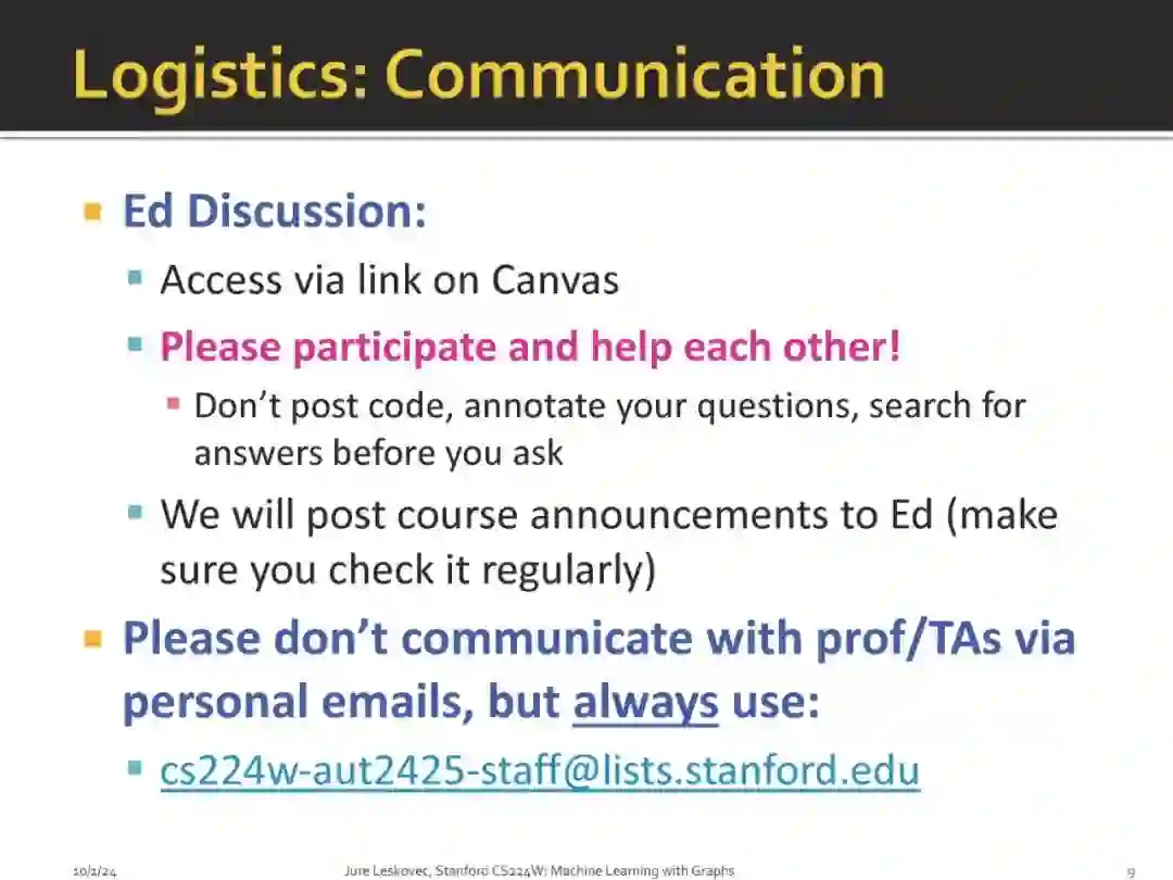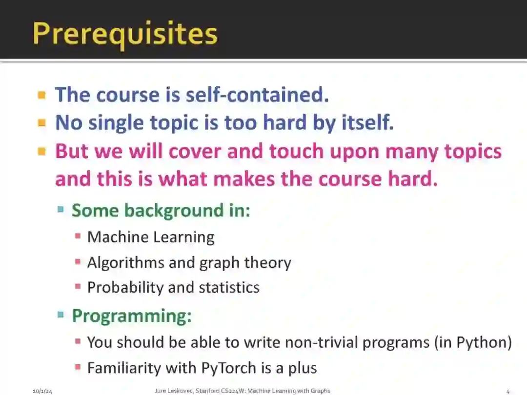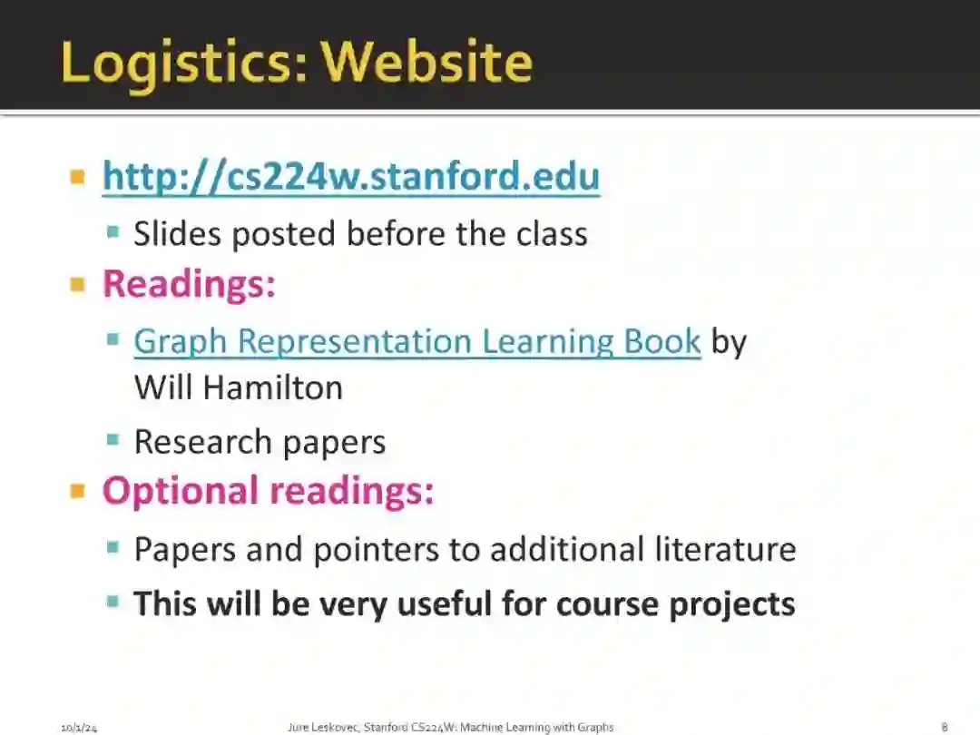 课程内容是什么?复杂数据可以表示为对象之间关系的图。这类网络是建模社会、技术和生物系统的基本工具。本课程侧重于分析大规模图时所面临的计算、算法和建模挑战。通过研究底层图结构及其特征,学生将学习适用于多种网络的机器学习技术和数据挖掘工具,以揭示其中的洞见。课程主题包括:表示学习和图神经网络(GNN);万维网算法;知识图推理;影响力最大化;疾病爆发检测,社交网络分析。