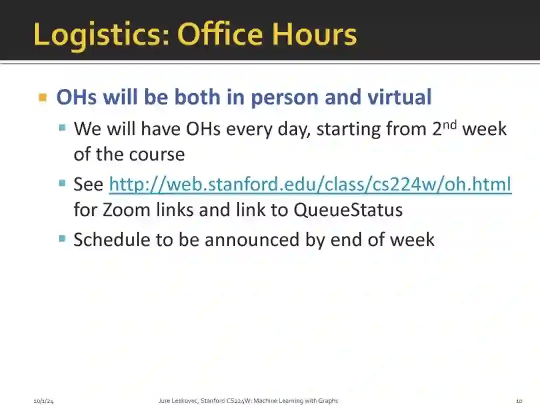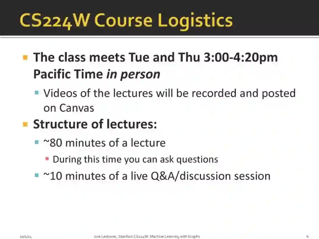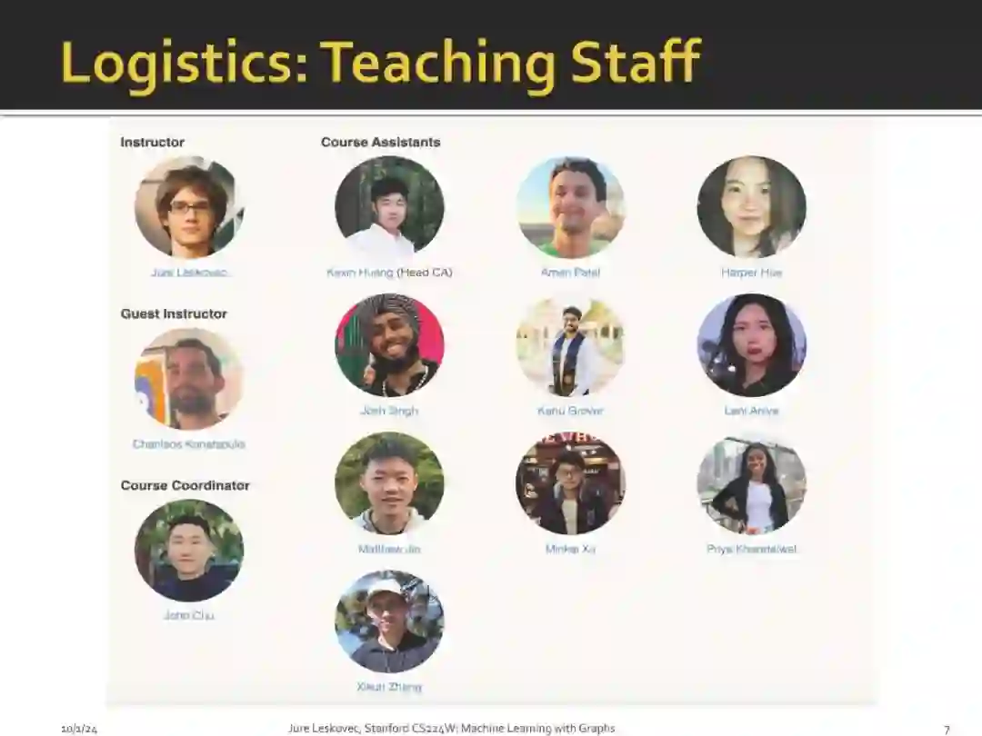 主讲人是图网络领域的大牛Jure Leskovec,是斯坦福大学计算机学院的副教授,也是图表示学习方法 node2vec 和 GraphSAGE 作者之一。在谷歌学术搜索(Google Scholar)上,Jure拥有接近14.5万的论文引用数量,H指数为142。