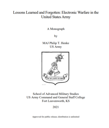 这部专著重点讨论了美国陆军在使用EW期间和之后所获得的教训和遗忘。第二次世界大战、越南、"沙漠之盾 "和 "沙漠风暴 "行动。仔细研究这三次冲突中的战争和所获得的教训,可以为美国陆军目前的战争装备、组织和理论提供参考。