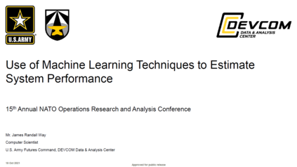 这项研究是在2019财年进行的,是题为 "机器学习技术协助生成项目级性能估计,用于班级和士兵级作战评估 "的研究的一部分。该研究的另一半将在另一份报告中讨论。在这一半的研究中,梯度增强的决策树被用来成功地预测人类主题专家(SMEs)的代理决定。(当所要求的系统没有数据时,一个类似的系统通常被用作代用。) 训练有素的决策树模型可以用来为未来的数据请求建议代理,减少满足这些请求所需的时间并提高所提供数据的准确性。