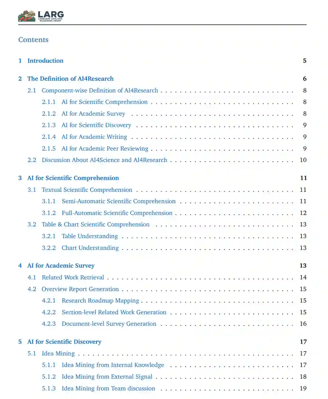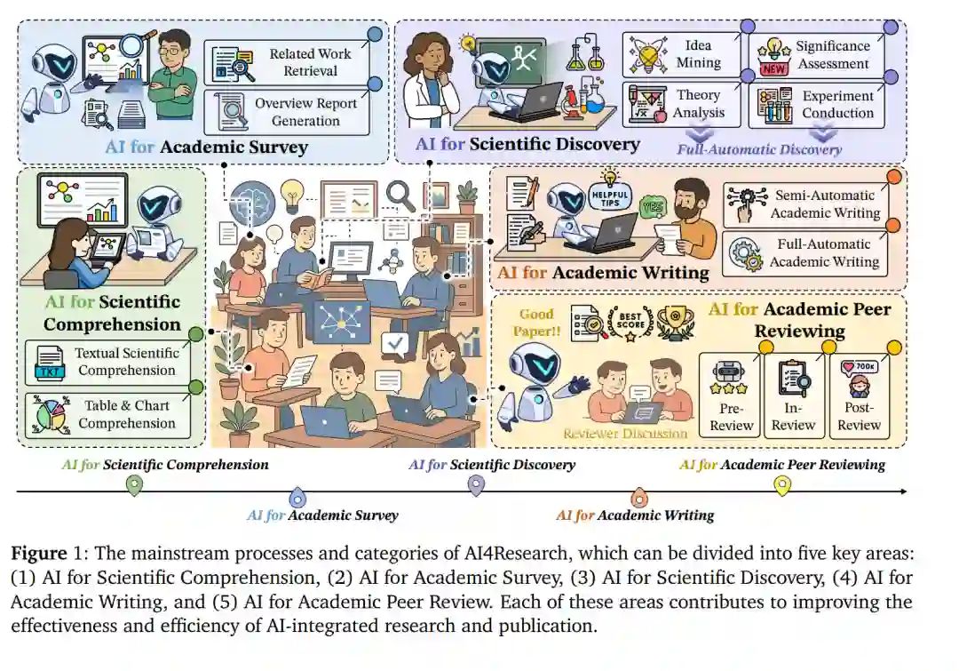 近年来,人工智能(AI)领域取得了显著进展,特别是在诸如 OpenAI-o1 和 DeepSeek-R1 等大型语言模型(LLMs)方面,已在逻辑推理和实验编程等复杂领域展现出卓越的能力。受这些进展的启发,众多研究开始探索 AI 在创新过程中的应用,尤其是在科学研究背景下的潜力。这些 AI 技术的核心目标,是构建能够在广泛科学学科中自主执行研究流程的系统。尽管该领域取得了重要进展,但关于“AI for Research(AI4Research)”的系统性综述仍然缺失,这在一定程度上限制了人们的整体理解,并阻碍了该方向的进一步发展。 为填补这一空白,我们提出了一项全面的综述工作,并提供了关于 AI4Research 的统一视角。具体而言,我们的主要贡献如下: 1. 系统性任务分类:我们首先提出了一种系统的分类方法,用于归纳 AI4Research 中的五类主流任务; 1. 研究前沿与挑战:接着,我们识别了当前研究中的关键空白,并重点讨论了未来的潜在方向,特别是在自动化实验的严谨性、可扩展性以及其社会影响方面; 1. 丰富的应用与资源:最后,我们整理了大量相关资源,包括多学科应用案例、数据语料库及工具,便于研究者快速获取并加以利用。