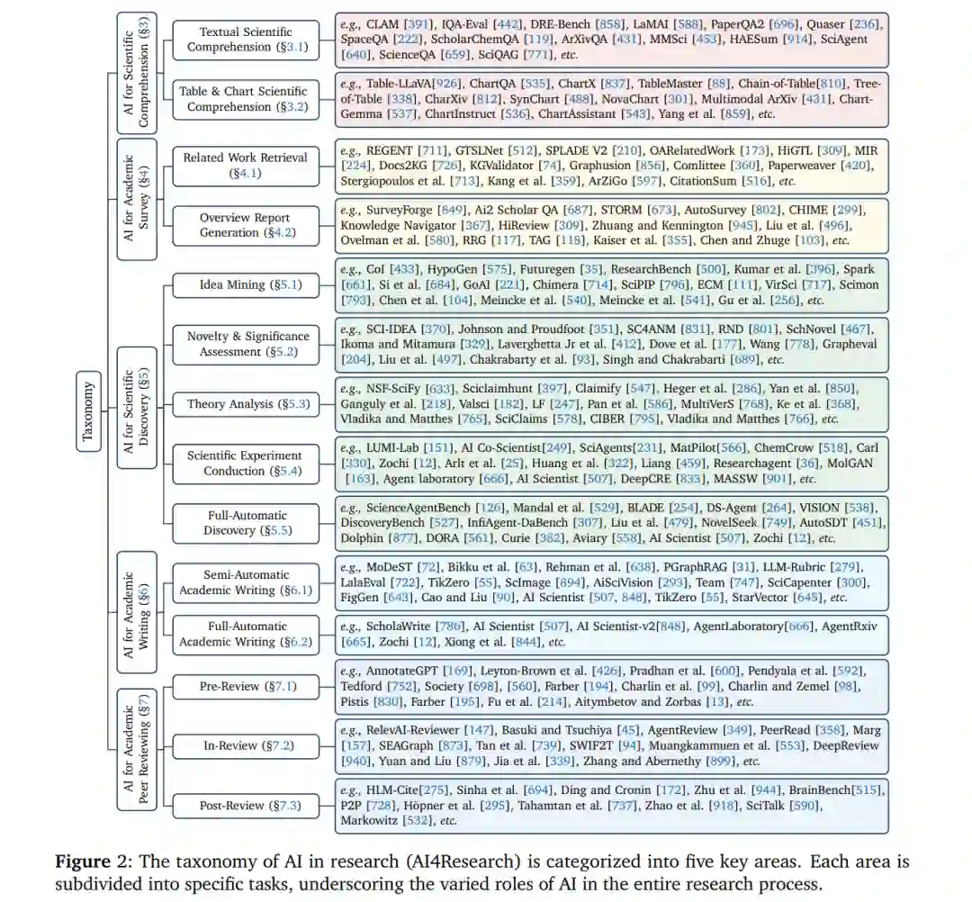 面对庞大的文献规模,我们特别强调了 AI4Research 的潜在研究前沿。未来的研究应优先发展能够融合多学科知识的跨领域 AI 模型,以促进跨学科协作;同时,解决 AI 系统中的伦理问题与偏差对于确保科研的公平性与透明度至关重要;提升模型可解释性、开发具备自适应能力的实时 AI 系统,以应对动态科学实验,也将成为推动 AI 在科研中发挥更大作用的关键。 此外,我们还总结了 AI4Research 中的关键应用与重要资源,包括代表性的多学科应用案例、开源框架与数据集仓库,以支持未来的深入研究。我们分别介绍了 AI 在自然科学、应用科学与工程、以及社会科学领域的研究实践。最后,我们回顾了模型开发中的关键工具与公开评测基准,这些都为训练与实验提供了丰富的数据支持。 本工作的主要贡献如下: * 科研 AI 的系统性分类方法:本文提出了一套完整的分类体系,涵盖科学理解、学术综述、科学发现、学术写作和学术评审五大方面,系统梳理了能够增强甚至自动执行科研各阶段任务的 AI 工具; * 新兴的未来研究方向:本文识别了 AI 在学术界的重要未来研究方向,包括发展跨学科 AI 模型、应对伦理与偏差问题、提升模型可解释性,以及探索用于动态科学实验的自适应 AI 系统; * 关键应用与丰富资源:我们系统汇总了 AI4Research 在自然科学、应用科学与社会科学领域的典型应用场景,并梳理了支撑科研流程的关键资源,包括开源框架、公共数据集、协作平台、云端 AI 服务与学术工具,涵盖科研发现管理、数据处理和 AI 驱动研究等多个方面。