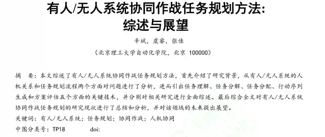 本文综述了有人/无人系统协同作战任务规划方法,首先介绍了研究背景,从有人/无人系统的人 机关系和任务规划流程两个方面对问题进行了分析,进而引出任务理解、任务分解、任务分配、行动序列 生成和方案评估五个方面的关键技术,并分别对相关研究进行全面综述。最后综合全文对有人/无人系统 协同作战任务规划的研究现状进行了总结和分析,并对该领域的未来提出展望。随着人工智能和人机共融技术的快速发展,有 人/无人系统协同作战成为作战研究领域的一大热 点,正在加速改变体系作战模式和战争形态。无人 系统因其低成本、无伤亡、高机动的特性,能够在 恶劣的环境下代替人类执行危险、繁琐的任务,但 其当前的智能化水平还无法适应战场环境的动态不确定性以及任务的复杂性,而融入人的智慧和综 合判断能力的有人系统有效弥补了这个缺陷。将二 者有机结合,有人/无人系统协同作战理念应运而生, 将逐渐成为未来战争中的主流样式。 近年来世界各军事强国充分利用有人系统和 无人系统的优势,围绕最大发挥有人/无人系统综合 作战效能的目标开展了大量研究。在政策层面,美 国国防部在 2014 年发布了《无人系统综合路线图 ( 2013-2038 ) 》 , 把 有 人 / 无 人 系 统 编 组 (Manned-Unmanned System Teaming,MUM-T)列 为重点关注的五个主题之一。在项目实施层面,英 国国防部和 QinetiQ 公司于 2007 年用一架“狂风”综 合航空电子研究样机(TIARA)作为指控飞机与三 架仿真无人机进行编队飞行实验,实现了有人战机 中一位飞行员直接控制 4 架飞机对地攻击的过程。 而最具代表性的研究始于 2015 年美国国防部提出 的“忠诚僚机”概念,针对这一概念,美国空军研究 实 验 室 和 克 瑞 托 斯 防 务 公 司 联 合 开 发 了 XQ-58A“女武神”无人机,并于 2020 年成功与 F-22 和 F-35 有人机一起进行了半自主飞行试验。 从作战过程的主要阶段进行分析,有人/无人系 统协同作战研究涉及到协同感知、认知、决策和控 制等方面,其中任务规划作为协同决策技术的中心 环节和发挥协同作战效能的关键环节,能够衔接作 战构想与作战任务的落实执行,实现对作战资源的 配置优化,提供科学准确的作战方案与计划[1]。与 纯无人系统相比,有人/无人作战体系规模大、成 员异构多样,特别是有人平台的加入增强了系统之 间的耦合性,其任务规划建模过程需考虑人机配比、 人机分工等因素,使得问题更加复杂。只有将人和 机器的能力、有人系统和无人系统的能力以及其内 部的相互关系充分体现出来,才得以更好地契合实 际作战场景。 各军事强国对有人/无人系统协同作战的任务 规划能力高度重视,视之为实现杀伤链快速闭合的 关键力量。当前与有人/无人系统协同作战任务规划 相关的文献主要以研究型论文为主,而综述论文鲜 有发表。鉴于此,本文从概念分析、协同模式和关 键技术三个方面对有人/无人系统协同作战的任务 规划方法进行了全面综述,对已有研究成果进行综 合分析并提出未来展望,旨在为该领域的研究人员 提供参考。在文献检索阶段,本研究主要依托中国 知网全文数据库,辅以 EI 数据库和 WOS 平台进行 交叉检索,以确保检索结果的全面性。