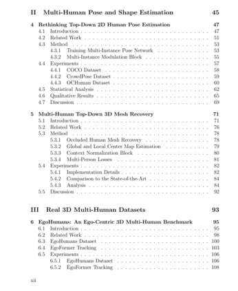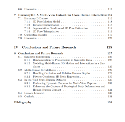 第二部分:多人姿态和形状估计。在这部分,我们解决了3D多人重建方法的关键限制。第4章主要关注2D姿态估计,尤其是在由遮挡和拥挤标记的复杂多人情境中。我们介绍了一套专为这些场景设计的新颖的自上而下的方法,有效地摆脱了限制性的单人假设。基于这一基础,第5章扩大了这些方法,以从图像中解决3D人体网格恢复的问题。我们的主要哲学是将人的点基表示与它们的边界框表示相结合。我们展示了,令人惊讶的是,这种简单的集成能够维持自己,即使在具有挑战性的多人遮挡的情境中也能够取得令人印象深刻的结果。 第三部分:真实的3D多人数据集。虽然在第一部分中,我们调查了用于3D的合成数据的使用,但第三部分将焦点转向真实的多人数据。在第6章中,我们设计了一个适合野外设置的无标记捕获系统,以记录多人活动,重点是动态活动,如体育和舞蹈。同时,我们引入了一个半自动的注释流程,以减少人为监督地生成大规模的3D注释,如人体姿态和网格。此外,为了捕获带有移动相机的3D场景,我们利用了主题的自中心视图,并为这一具有挑战性的视图提供了注释。然后第7章深入探讨,重点是多人互动,代表了人与人之间的扩展接触,包括摔跤、拥抱和舞蹈等活动。利用我们之前的方法,我们引入了一个增强的注释协议,旨在充分处理这些活动中固有的遮挡。总之,第6章和第7章中详细描述的努力共同为建立两个全面的多人3D数据集作出了贡献。 然而,为了开发更大的数据集和高效且普遍的3D多人方法,还有更多的工作要做。第8章通过讨论这一领域未来工作的具体方向来结束,包括短期和长期的方向。