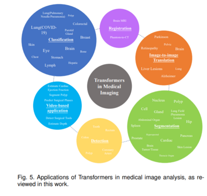 Transformers 已经主导了自然语言处理领域,最近又影响了计算机视觉领域。在医学图像分析领域,Transformer也已成功应用于全堆栈的临床应用,包括图像合成/重建、配准、分割、检测和诊断。我们的论文对Transformers 在医学图像分析领域进行全面调研。具体来说,我们首先概述了Transformer和其他基本组件中内置的注意力机制的核心概念。其次,我们给出了为医疗图像应用程序量身定制的各种Transformer架构的新分类,并讨论了它们的局限性。在这篇综述中,我们研究了围绕在不同学习范式中使用Transformer、提高模型效率以及它们与其他技术的耦合的关键挑战。我们希望这篇综述能给医学图像分析领域的读者一个全面的Transformers 的综述。