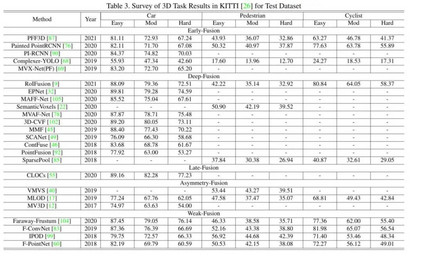 有些工作不能简单地定义为上述任何一种融合,因为它们在整个模型框架中拥有不止一种融合方法。造融合怪是我们这些盐究圆天生的技能,你说A有xxx好处,B有xxx好处,那我A+B不就是直接赢麻了吗?但是事实上,很多情况都不能有效的把方法缝合进去。如深度融合和后融合方案的相互结合,或者将前融合和深度融合结合在一起。这些方法在模型设计上存在冗余问题,并不是融合模块的主流方法,即没有取得A+B的效果,反而极大的牺牲了推理时间已经增大了算法的复杂度。一些实验结果 2Dkitti上的结果