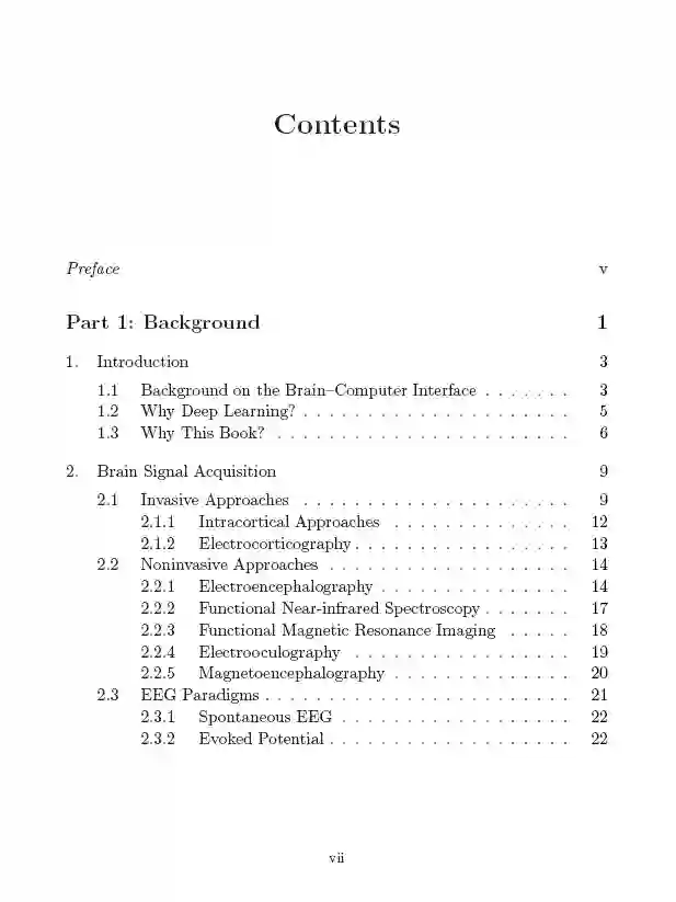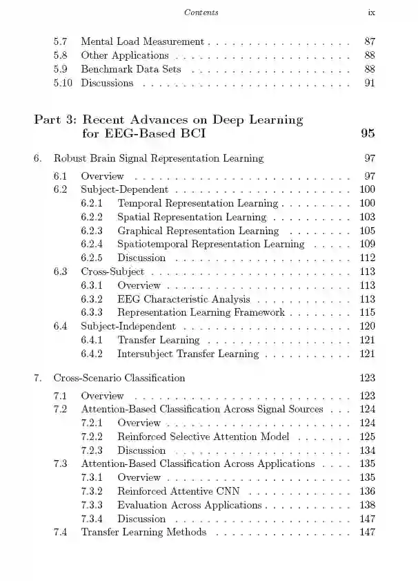 这本书提出了一个高度综合的总结,常用的大脑信号;系统介绍了深度学习模型的12个子类;在BCI领域采用深度学习的200多项最新研究的扩展总结;本文概述了许多BCI应用以及深度学习的贡献,以及31个公共BCI数据集。作者还介绍了一套新的深度学习算法,旨在解决当前BCI的挑战,如鲁棒表示学习、跨场景分类和半监督学习。本文提出了各种基于深度学习的真实世界BCI应用,并给出了一些原型。其中所包含的工作提出了有效和高效的模式,将为学术界和工业界从事BCI工作的人提供灵感。
