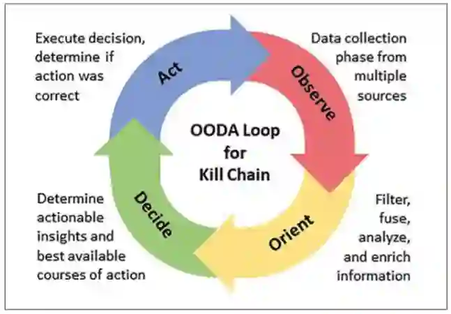 杀伤链这个术语是指涉及使用武器的攻击结构。该过程被描述为一个链条,以说明用武器攻击目标需要一套完整的端到端决策和行动,任何阶段的中断都会破坏该过程。Clawson等人(2015)将杀伤链描述为 "成功使用特定武器对付特定威胁所需的任务或功能"。杀伤链过程包括目标检测、选择与目标交战和选择武器所涉及的决策,以及攻击的实际执行。