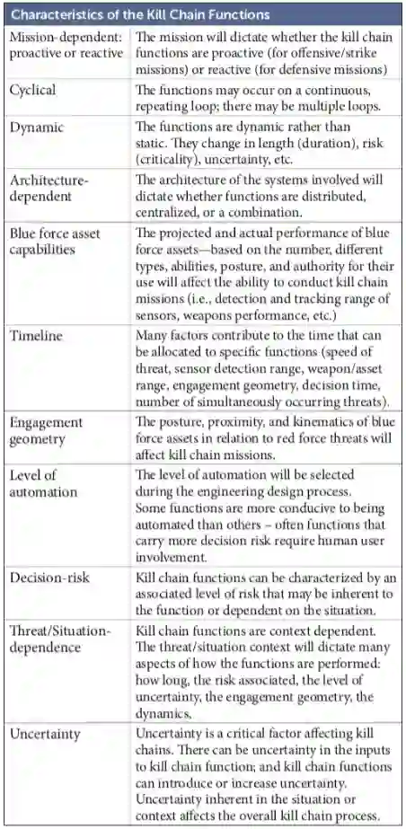 杀伤链的功能是通用的,适用于涉及 "杀伤"行动的各种战术行动。在这项研究中,杀伤链可以支持进攻性打击和防御性任务;杀伤可以是硬的,也可以是软的。这允许使用非致命性和反措施行动,以消除对手的资产,完成战术任务。