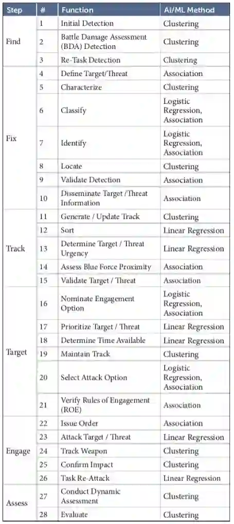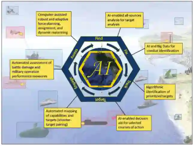 这项研究开发了一个框架,以评估人工智能方法对杀伤链特定功能的适用性。该评估包括两个部分: (1)从杀伤链功能的角度进行的定量分析,以及(2)从人工智能主题的角度进行的定性分析。
