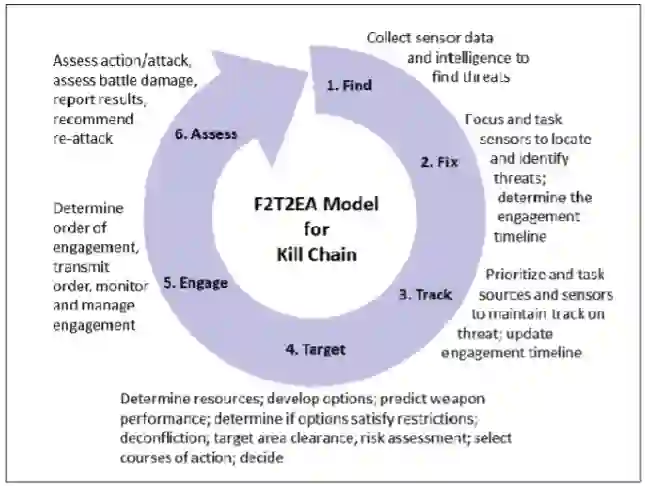 OODA循环模型为理解杀伤链过程提供了基础,并导致了对图4所示的查找-修复-跟踪-目标-评估(F2T2EA)杀伤链过程模型(参谋长联席会议,2013)的研究。F2T2EA是另一个以军事术语描述杀伤链的过程模型。F2T2EA模型将战术功能分为六类,并强调战术行动的周期性。F2T2EA抓住了战术战争功能、决策和行动的细微差别,为人工智能的映射提供了一个更详细的框架,以激发具体、全面和独立的杀伤链功能。