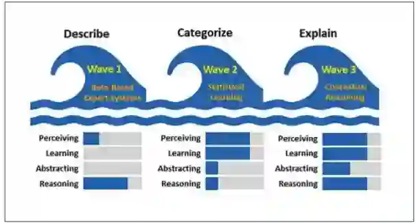 DARPA的Launchbury(2017)将人工智能的发展描述为三波,如图5所示。第一次浪潮(约1970年代至1990年代)产生了基于规则的专家系统,可以推理,但没有学习或归纳的能力。第二波(约2000年至今)产生了先进的统计大数据学习和深度神经网络,它们可以感知和学习,但推理或概括的能力有限。第三次浪潮,刚刚开始(2020年及以后),将以上下文适应为特征,在推理和概括能力方面取得进展。未来学家预测,第四次浪潮(2030年及以后)将导致人工通用智能,使机器能够执行人类能够执行的任何智力任务(Jones 2018)。