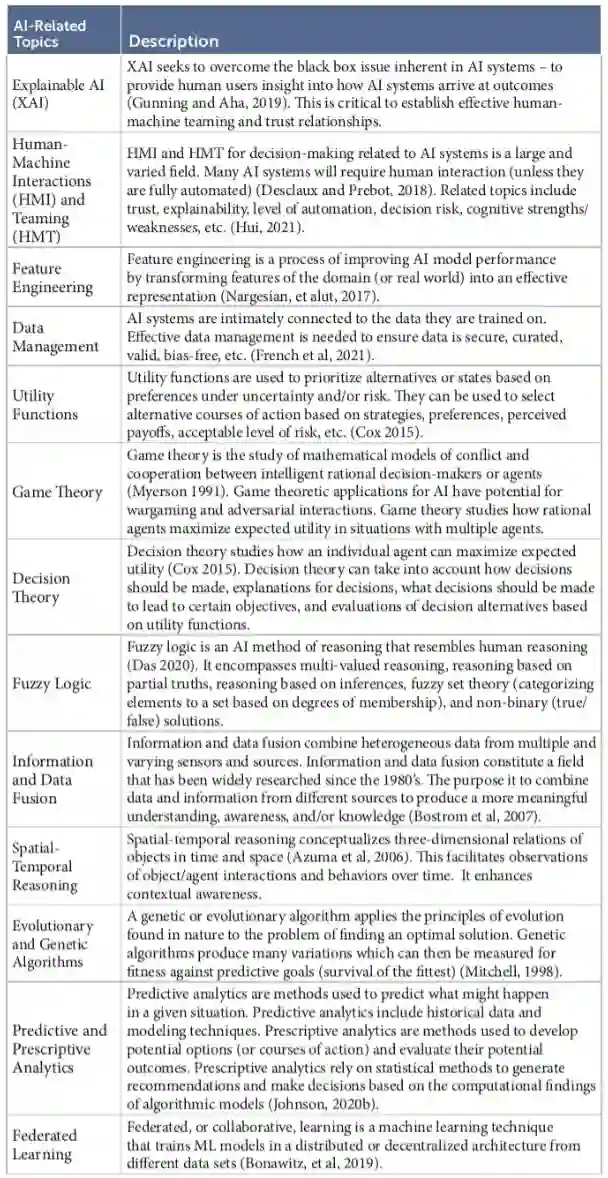 表3中描述的主题是方法、学科和支持能力的类别,它们可能直接影响到为杀伤链有效部署AI的能力。每种方法的实施方式将决定未来人工智能支持的杀伤链的不同方面。人工智能内部工作的可解释性和人机合作的能力将影响作战人员与人工智能系统的互动和信任。特征工程、数据管理和实用功能将影响到人工智能系统的内部运作,因此也影响到人工智能系统的输出和决策建议。博弈论、决策论、模糊逻辑、融合、空间-时间推理、进化和遗传算法、预测性和规定性分析以及联邦学习等学科被纳入的方式将决定未来人工智能系统的设计和架构。表3中的人工智能相关主题被用于本文下一节解释的定性评价。