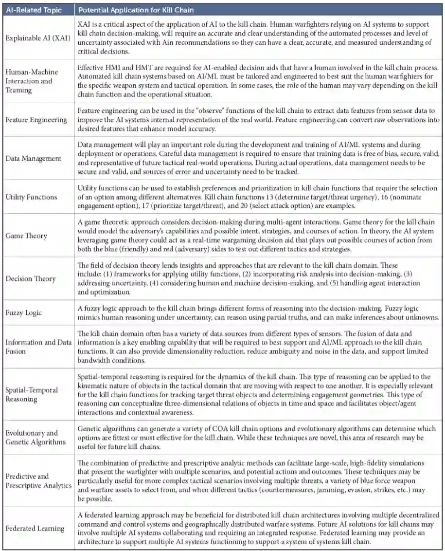 表3. 人工智能相关主题在杀伤链研究中的考虑