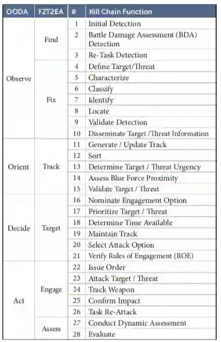 这项研究开发了一套28个杀伤链功能,列于表1。该表显示了这些功能是如何被归入OODA和F2T2EA杀伤链过程模型的。建立一套具有一定独立性的不同功能的目的是为了支持特定的人工智能方法与特定的杀伤链功能的映射,同时保持它们能够代表战术行动中发生的各种海军决策和行动。