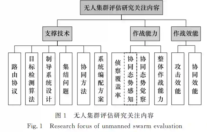 试验评估是促进装备系统作战能力生成和实战化应用的重要手段。无人集群依靠自组网实现复杂交互, 具备典型的智能性和涌现性, 开展无人集群试验评估研究面临着指标不清、标准模糊、技术方法落后等难题。为了进一步推动无人集群试验评估理论研究, 对国内外已开展的无人集群试验评估相关规划和项目实践现状进行了概述。面向评估指标设计和评估方法研究两个试验评估关键环节, 首先对已有无人集群评估文献中使用的指标进行了分类梳理, 并分析了现有研究在指标选取和构建方面的特点与不足; 然后, 结合不同无人集群关键技术研究中涉及的评价指标, 提出了面向无人集群关键技术能力的评估指标设计思路。在此基础上, 根据具体含义及计算方式, 将已有指标划分为基础指标和综合指标2类, 分类介绍了可用的评估方法, 期望为后续无人集群试验评估的指标构建和评估方法选取工作提供一定借鉴。 人工智能技术的迅速发展使得智能化的网络信息体系 成为军事领域的重要变革趋势,未来战争逐渐呈现出无人化 和智能化的特征[1]。近年来,各国高度重视无人装备的相关 研究,单体无人装备的性能大幅提升,但其完成任务的能力 始终有限,无人集群协同作战应运而生。无人集群最初由无 人飞行器发展而来[2],是群体智能与无人系统相结合的产 物[1]。其概念可描述为:无人集群是由一定数量的智能和非 智能无人装备,以单平台装备的作战能力、自主协同技术和 集群控制算法为基础,以平台之间的自组网通信为支撑,围 绕任务目标,模拟自然界生物集群形成的具有功能分布化、 行为涌现性特征的作战体系[1,34]。目前,无人集群大致可分 为无人机集群、地面无人车集群、水面无人艇集群、水下无人 潜航器集群以及上述无人装备的跨域联合[5]。上述同构或 异构无人集群通过个体之间的自主协同实现作战能力涌现, 达到“1+1>2”的效果,成为未来战场中的颠覆性力量。无 人集群自主协同是指在无人参与或人工监测下,具备一定自 主性的集群个体既能够独立地完成给定任务,又能够自发地 交互协同完成群体任务[67]。实现自主协同是构建无人集群 的根本目的,也是其最终发展目标。近年来,世界各主要军 事强国面向自主协同的无人集群开展了大量的研究项目,内 容集中于无人装备平台技术研发、集群自主协同技术探索、 作战样式设计以及相关演示验证等方面。但在整体上,无 人集群的研究仍处于技术探索和发展融合阶段,为验证能 否满足理想的作战需求,还需要进行大量的试验评估工作。 试验评估是试验鉴定的重要环节,装备试验评估是在 科学组织试验的基础上,依据对试验所得数据的综合分析, 得到装备性能、作战效能、适用性等方面的正确评价结论, 为确定装备是否满足研制要求和使用需求提供依据。无人 集群的试验评估是其从作战概念走向实际应用的重要桥 梁,对于检验无人集群发展水平、指导无人集群实战化应用 具有重要意义。在概念界定上,无人集群试验评估尚无统 一定义。梁晓龙等[1]在已有研究和实践基础上认为,无人 集群试验评估是通过提供科学规范的评估过程、方法,以及 置信度高、适应性广的评估模型,得到对集群自主协同能 力、系统健壮性和作战效能等的量化评价。基于该认识,本 文将现阶段的无人集群试验评估描述为:基于高置信度的 评估指标和模型,实现对无人集群自主协同特征的有效描 述,以明确试验数据需求并完成数据获取与综合分析,达到 对无人集群的性能、作战效能及潜在的作战适用性、体系适 用性等进行评价的目的,为无人集群是否满足研制要求和 使用需求提供依据。 区别于传统的装备系统,自主协同的无人集群执行任 务时具有鲜明的系统涌现性特点,整个集群在作战过程中 需要对瞬息万变的作战环境做出动态的智能决策和协同调 整。因此,无人集群试验评估存在着评估指标设计难、评估 模型要求高等特点[8],传统试验评估理论已难以适用。针 对这一现实问题,本文在对国内外无人集群试验评估规划 和项目实践现状进行总结的基础上,重点对评估指标设计 和评估方法选取两个关键技术环节的研究进行了系统地分 析和梳理,为后续无人集群试验评估工作提供借鉴。 本文结构组织如下:第1节介绍国内外在无人集群试 验评估规划和项目实践方面的研究现状;第2节在对已有 无人集群评估研究中使用的指标进行梳理和分析的基础 上,进一步对各无人集群关键技术涉及的评价指标进行了 描述总结,给出了对各关键技术能力进行评估的指标设计 思路;第3节按照具体含义和计算方式将无人集群评估指 标分为基础指标和综合指标,并分类介绍了无人集群试验 评估方法;第4节对本文内容进行总结。