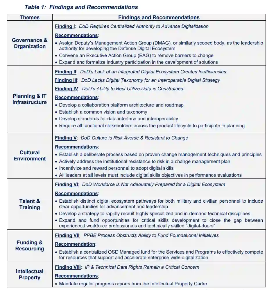 小组委员会的结论是,美国防部和国防工业基地(DIB)正在进行的数字化工作发展迅速且极其复杂。小组委员会很快认识到不可能对这些活动进行全方位的审查,因此将调查重点放在那些会直接影响和加速我军研发、采购、维持和作战的领域。