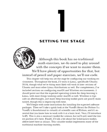 Introduction Chapter 1: Setting the Stage Chapter 2: Probability Chapter 3: More Probability Chapter 4: Statistics Chapter 5: Linear Algebra Chapter 6: More Linear Algebra Chapter 7: Differential Calculus Chapter 8: Matrix Calculus Chapter 9: Data Flow in Neural Networks Chapter 10: Backpropagation Chapter 11: Gradient Descent Appendix: Going Further View the Copyright page