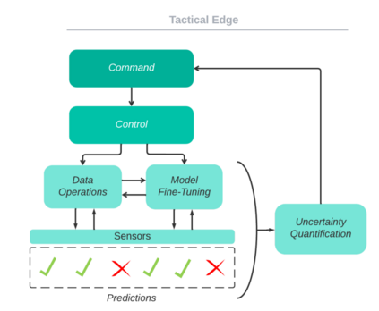 指挥与控制 (C2) 系统越来越多地采用计算机视觉 (CV) 系统来改进战场上的情报分析,即战术边缘。CV 系统利用人工智能 (AI) 算法来帮助可视化和解释环境,从而提高态势感知能力。然而,由于环境和目标瞬息万变,部署的模型可能会被混淆,因此 CV 系统在战术边缘的适应性仍面临挑战。由于环境和环境中存在的物体开始发生变化,在这种环境中使用的 CV 模型在预测时可能会变得不确定。此外,任务目标的快速变化也会导致技术、摄像机角度和图像分辨率的调整。所有这些都会对系统的性能产生负面影响,并可能给系统带来不确定性。当训练环境和/或技术与部署环境不同时,CV 模型的表现可能会出乎意料。遗憾的是,大多数战术边缘场景并未将不确定性量化(UQ)纳入其部署的 C2 和 CV 系统。本概念文件探讨了在战术边缘同步进行由 UQ 驱动的稳健数据操作和模型微调的想法。具体来说,根据预测的残差整理数据集和训练子模型,使用这些子模型计算预测区间(PI),然后使用这些 PI 校准部署的模型。通过将 UQ 纳入战术边缘 C2 和 CV 系统的核心操作,我们可以帮助推动战场上有目的的适应性。