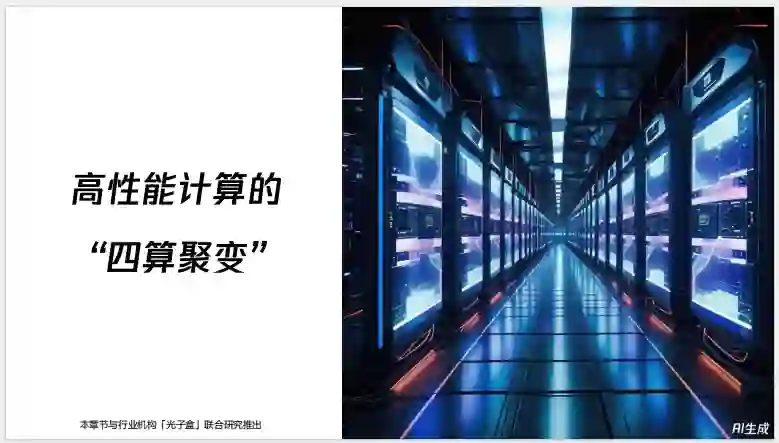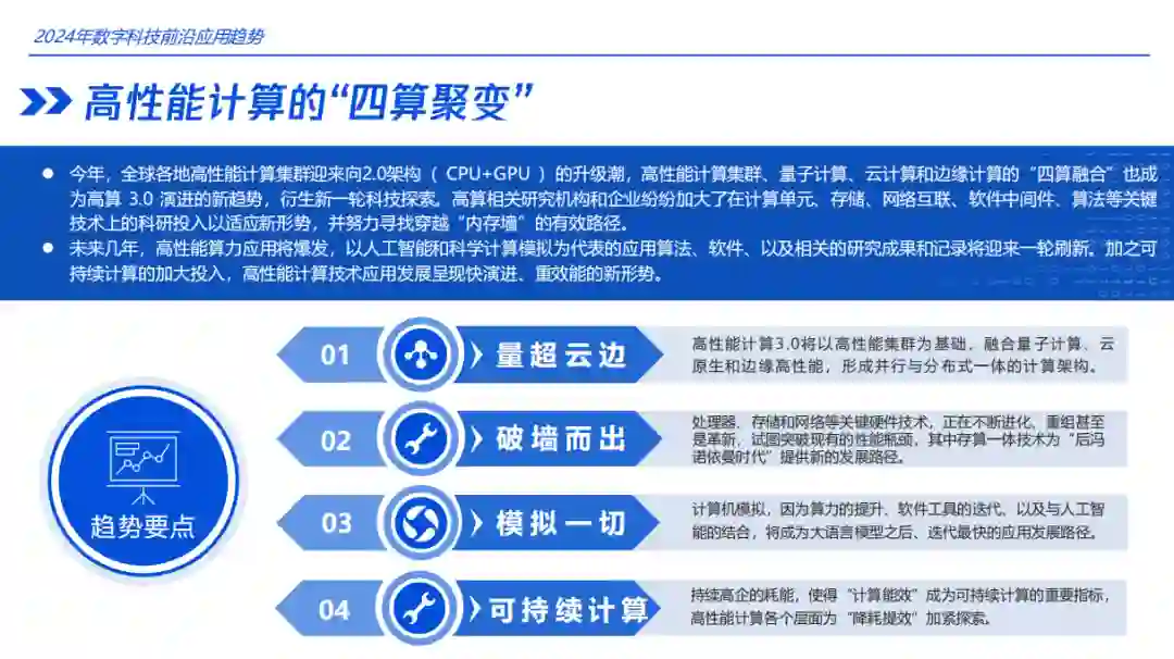这一章节主要讲述了数字科技的发展趋势以及未来可能出现的技术革新。其中包括高性能计算、量子计算、云计算和边缘计算等技术的融合,以及通用人工智能的逐渐实现。此外,文中还提到了机器人技术、脑机接口、能源变革等方面的发展,并强调了人工智能的重要性及其在未来社会中的作用。总之,本文旨在展示数字科技发展的前景以及其对我们生活和社会的影响。 高性能计算的四算聚变与智能化升维
