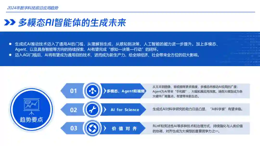 《智能科技 跨界相变——2024 数字科技前沿应用趋势》主要讨论了2024年数字科技前沿应用趋势,包括云-边端协同计算、机器人视觉、云端计算、文本分析、边缘计算、LLM+机器人认知学习、多模态感知、内置微型驱动器、交互式AI等关键技术点的发展情况。此外,文章还提到了基因组学和脑机接口技术的前沿发展,以及沉浸式媒体技术的趋势要点。预计未来几年这些领域将迎来重大突破和创新。