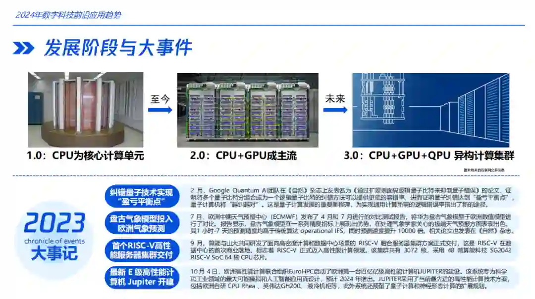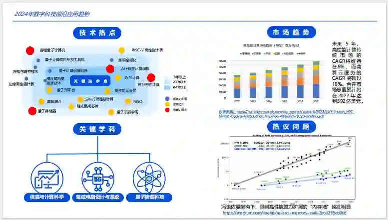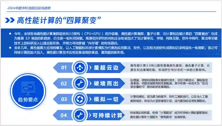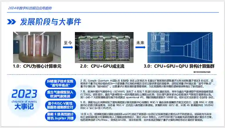 高性能计算、量子计算和云原生技术的发展 这一章节主要介绍了2024年数字科技前沿应用趋势。其中提到了高性能算力的充分利用和云计算技术的引入是必要选择,现有的高算集群云原生化脚步正在加快。另外,量子云服务的普及有助于上层软件和应用的高效研发,高性能计算走向云边协同也是一个重要的方向。此外,量超融合也成为行业共识,通过将计算任务在量子计算机和高性能集群之间进行分解和调配,实现量超协同,在大幅节约资源的情况下,双向发挥量子计算机和超级计算机各自的优势。最后,这一章节还介绍了一些最新的技术和产品,例如谷歌云提出的“算力多切片训练”方案,以及IBM云原生高算Vela等。