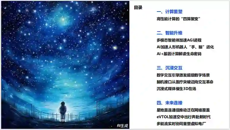 这一章节主要介绍了数字科技前沿应用的趋势和发展方向,包括计算重塑、智能升维、沉浸交互和未来连接等方面。其中,计算重塑部分重点讨论了高性能计算的“四算聚变”趋势,即高性能计算集群、量子计算、云计算和边缘计算的融合。智能升维则聚焦于多模态智能体加速AGI进程、AI加速人形机器人“手、脑”进化、AI+基因计算解读生命密码等领域。沉浸交互部分探讨了数字交互引擎激发超级数字场景、脑机接口从医疗突破迈向交互革命、沉浸式媒体催生3D在场等问题。未来连接部分则展望了星地直连通信推动泛在网络覆盖、eVTOL加速空中出行奔赴新时代、多能流实时协同重塑虚拟电厂等前景。