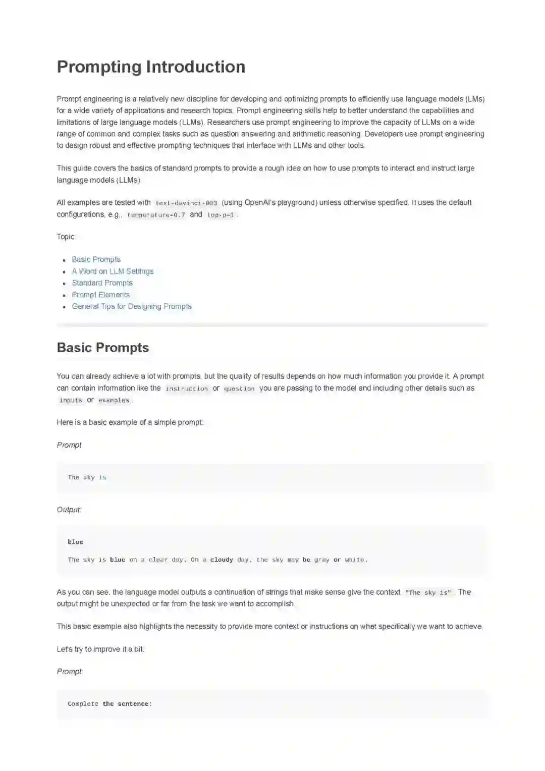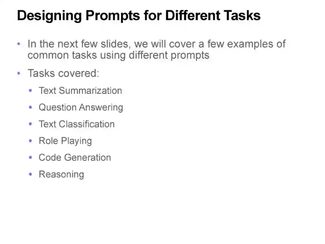 在前一节中,我们介绍并给出了如何提示LLMs的基本示例。 在本节中,我们将提供更多示例,说明如何使用提示来实现不同的任务,并介绍其中的关键概念。通常,学习概念的最好方法是通过示例。下面我们将介绍几个示例,说明如何使用精心设计的提示来执行不同类型的任务。 主题: * 文本摘要 * 信息提取 * 问题回答 * 文本分类 * 谈话 * 代码生成 * 推理