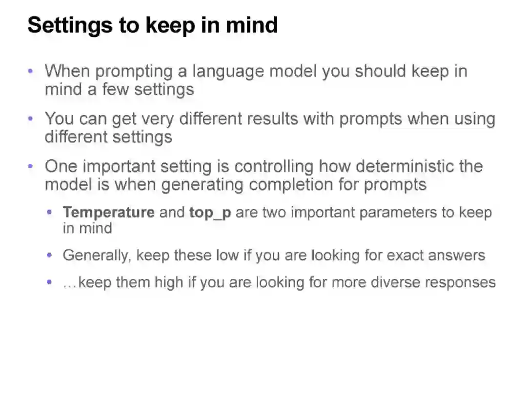 在处理提示时,您将通过API或直接与LLM交互。您可以配置一些参数以获得不同的提示结果。 Temperature ——简而言之,Temperature 越低,结果越确定,因为总是选择可能性最高的下一个token。升高的Temperature可能导致更多的随机性,鼓励更多多样化或创造性的输出。我们实际上是在增加其他可能token的权重。在应用方面,我们可能希望对基于事实的QA等任务使用较低的Temperature,以鼓励更事实和更简洁的回答。对于诗歌生成或其他创造性任务,提高Temperature可能是有益的。 Top_p -类似地,使用Top_p(一种称为核采样的Temperature采样技术),您可以控制模型生成响应的确定性程度。如果你正在寻找准确和事实的答案,请保持这个数字较低。如果您正在寻找更多样化的响应,请增加到更高的值。 一般的建议是改变其中一个,而不是两个都改变。 在开始使用一些基本示例之前,请记住,您的结果可能会因您使用的LLM版本而有所不同。 提示的基础知识