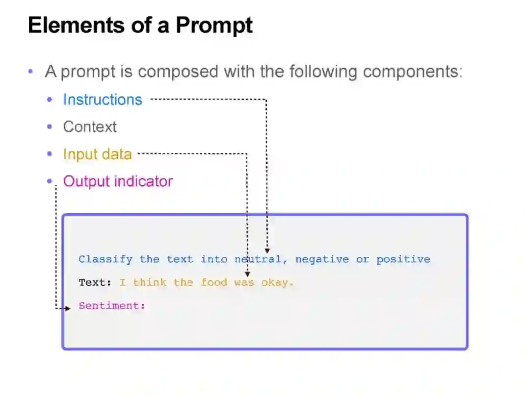 提示的元素 随着我们介绍提示工程可能提供的越来越多的示例和应用程序,您将注意到有一些组成提示的元素。 提示(prompt)可以包含以下任何一个组件。 * 指令(Instruction):希望模型执行的特定任务或指令 * 上下文 context ——可以包含外部信息或额外的上下文,这些信息可以引导模型做出更好的响应 * 输入数据——是我们感兴趣的输入或问题 * 输出指示器 Indicator :表示输出的类型或格式。