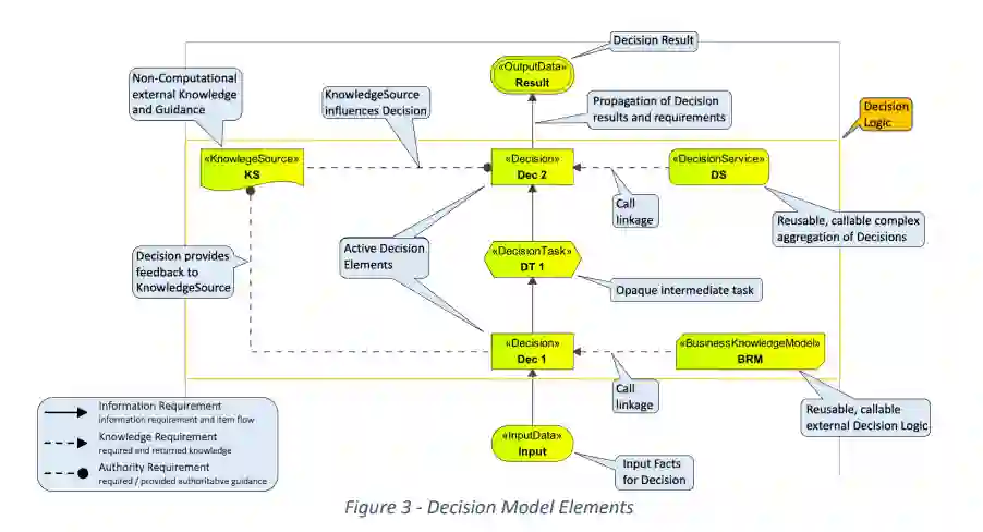 许多建模方法包括隐含或嵌入的决策制定。这些建模案例有流程图、活动图、业务流程模型等等。决策建模作为一门专门的学科是比较新的。对象管理小组创建了决策建模和符号(DMN)规范,最初是为了使BPMN1业务流程模型中的决策更加明显,并支持更详细的决策过程。这段历史的缺点是,DMN现在与BPMN的关系非常紧密,尤其是在元模型层面。因此,DMN,不能直接与UML或SysML集成。为了使DMN风格的决策建模与UML和SysML模型协作,特别是使现有的UML建模工具能够进行DMN风格的决策建模,必须创建一个决策建模UML配置文件,与DMN元模型密切相关。