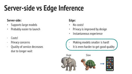 另一方面,边缘推断的好处是显而易见的:1. 服务成本大大降低。2. 通过设计提高用户隐私,因为所有处理都在设备上运行,而不需要在服务器和设备之间传输数据。3. 它便于用户交互,因为没有传输可以减少延迟。4. 减少构建许多新的基于计算机视觉的应用程序的周期时间,因为不需要昂贵的基础设施。