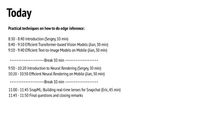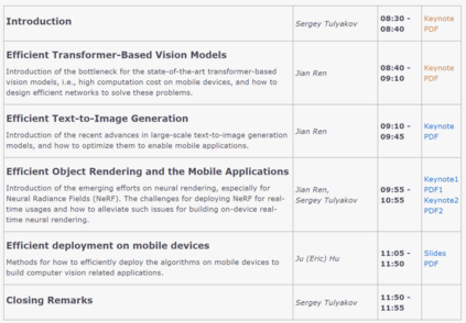 这个教程将介绍重新设计算法的有效方法,以实现高效的内容理解、图像生成和神经渲染。最重要的是,我们将展示如何将算法有效地部署在移动设备上,最终实现用户与移动设备之间的实时互动。