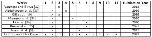 通过将人工智能/ML与云、雾、边缘、无服务器和量子计算结合起来,我们创造了第一个同类的评论。在以前的调查的基础上,这项新的研究给出了一个新的富有想象力的方法来评估和识别当前的研究挑战。表1根据不同的标准,将我们的评论与现有的调查进行了比较。