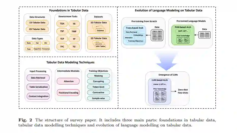 尽管人们对此领域的兴趣日益增长,但关于表格数据语言建模技术的全面综述仍然缺乏。本文填补了这一空白,系统回顾了表格数据语言建模的发展,内容包括:(1) 不同表格数据结构和数据类型的分类;(2) 模型训练中使用的关键数据集和评估任务的回顾;(3) 建模技术的总结,包括广泛采用的数据处理方法、流行架构和训练目标;(4) 从传统的预训练/预训练语言模型到大型语言模型的演变;(5) 识别表格数据分析中语言建模的持续挑战和潜在的未来研究方向。与本综述相关的GitHub页面可访问:https://github.com/lanxiang1017/Language-Modeling-on-Tabular-Data-Survey.git。 关键词: 语言建模, 表格数据, 预训练语言模型, 大型语言模型