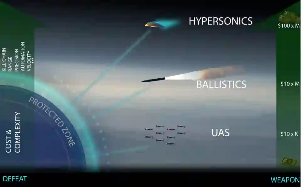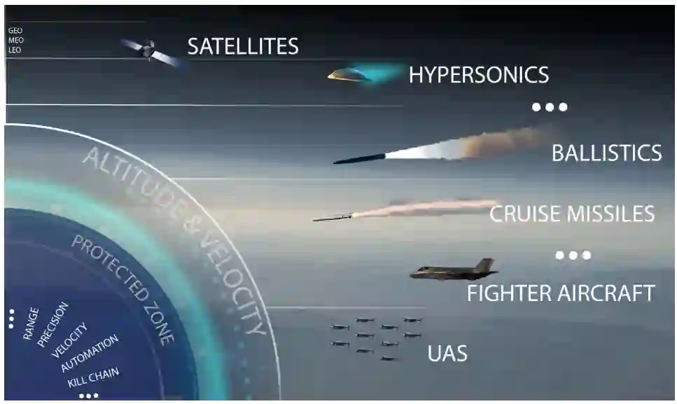 图 1. 现在,武器横跨所有领域,导弹(包括无人驾驶航空器系统 [UAS])可从陆地、空中和海上发射,定向能武器等非动能武器可跨领域使用(例如,可附加到战斗机上)。如白点所示,这幅图并不是一份包罗万象的武器清单;相反,它展示了不断扩大的威胁环境,并为有效保护一个地区必须考虑的因素奠定了基础。