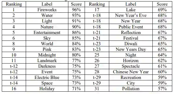 然而,当试图只给整个图像贴上标签而不是搜索特定的物体时,Vision AI明显改善了其预测结果。这些结果,即排名、标签和分数,都显示在表1-1中。开头用 "t-"表示的排名代表得分相同。在排名的顶部,这些标签似乎适合于该图像,特别是 "烟花 "以96%的分数出现在顶部。有几个标签激起了人们对该算法如何工作的好奇心。尽管 "地标 "和 "空间 "的得分是77%,但如果从图像的表面价值来看,它们是不准确的。有几个标签似乎很难被普遍可视化,如 "午夜"、"事件 "和 "假日"。最后,有些标签可能是准确的,也可能是不准确的,这取决于标签的使用环境(例如,同音字,如 "光 "的亮度或重量,这两个词在这里都很合适),以及图片的拍摄环境(例如,"除夕"、"排灯 "和 "中国新年")。