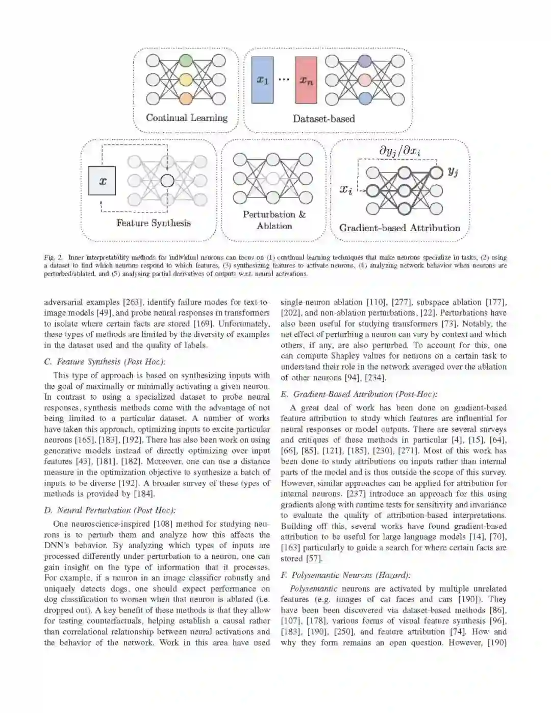 我们的重点是DNN的内部可解释性方法。值得注意的是,模型无关技术、黑箱技术、输入归因方法、神经符号方法和“优秀的老式AI”超出了本次综述的范围。这并不是说它们在构建安全人工智能方面的价值低于我们所关注的方法——我们相信多样化的技术是至关重要的。然而,我们专注于内部可解释性方法(1),因为该综述的可跟踪范围,(2) 因为它们对某些目标(如理解如何修改模型、反向工程解决方案,以及检测通常不会出现在系统部署行为中的潜在知识)有很好的装备。也请参阅之前对可解释性工作的一些调查和评论,它们与我们的[3],[58],[60],[68],[95],[118],[136],[173]-[175],[208],[215],[218],[219]有重叠。然而,这项综述的不同之处在于其对内部可解释性、人工智能安全以及可解释性和其他几个研究范式之间的交叉的关注。参见我们在第VI节的讨论。在接下来的章节中,我们根据DNN的计算图解释的部分来组织我们对技术的讨论: 权重、神经元、电路或表示。图1描述了内部方法是如何这样组织的。除了这种分解,可解释性技术还可以按照它们是在模型训练期间使用还是在模型训练之后使用来划分。内在可解释性技术包括训练模型,使其更容易学习或具有自然的解释。Post hoc技术的目的是在模型经过训练后对其进行解释。我们在分段层次上根据方法是内在的还是事后的来划分方法。这两种方法并不相互排斥。