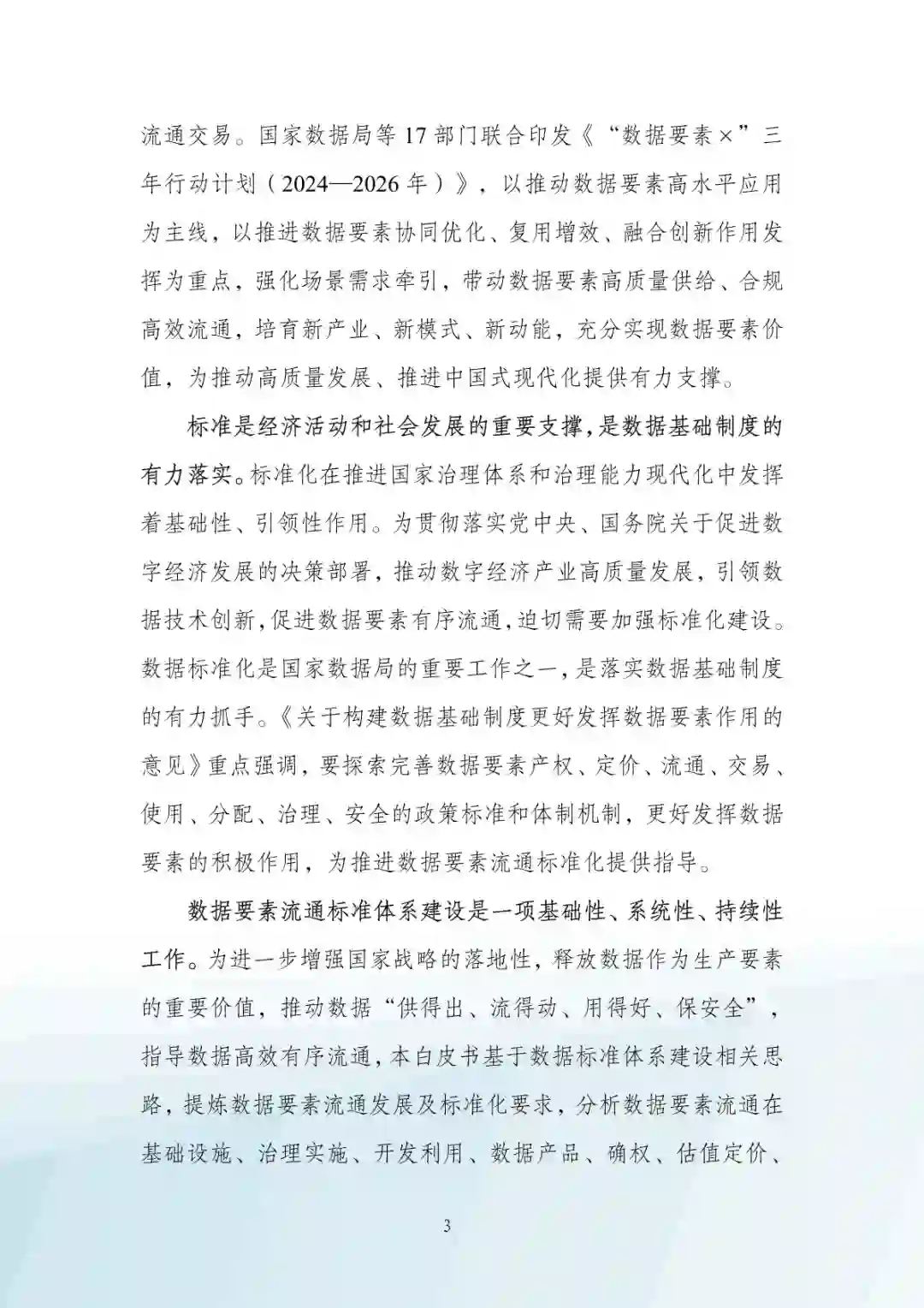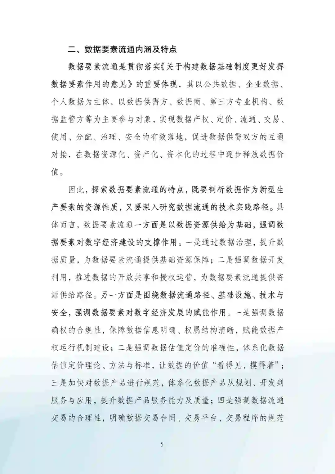 数据要素流通是贯彻落实《关于构建数据基础制度更好发挥 数据要素作用的意见》的重要体现,其以公共数据、企业数据、 个人数据为主体,以数据供需方、数据商、第三方专业机构、数 据监管方等为主要参与对象,实现数据产权、定价、流通、交易、 使用、分配、治理、安全的有效落地,促进数据供需双方的互通 对接,在数据资源化、资产化、资本化的过程中逐步释放数据价值。