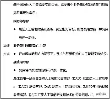 **一是英国国防部需要转变为“人工智能就绪”的组织。**具体措施是:1)推动文化、技能和政策变革,培训领导人,提高人员技能,并加强国防人工智能和自主部门的组织能力;2)创建国防人工智能技能框架和新的人工智能职业发展和晋升路径;3)将数据视为关键战略资产进行管理和应用,建设新的数字主干网络和国防人工智能中心。