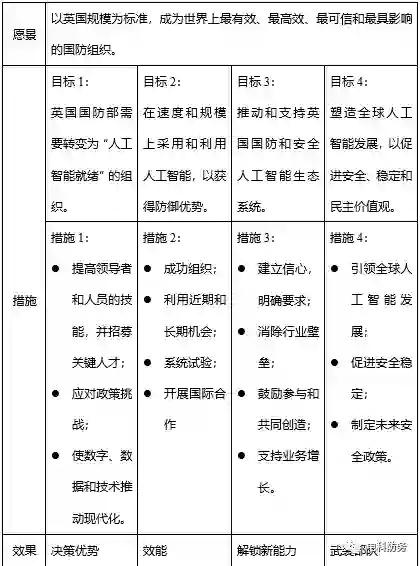 英国国防部人工智能战略的愿景是:以英国规模为标准,成为世界上最有效、最高效、最可信和最具影响的国防组织: