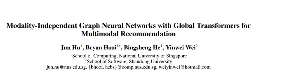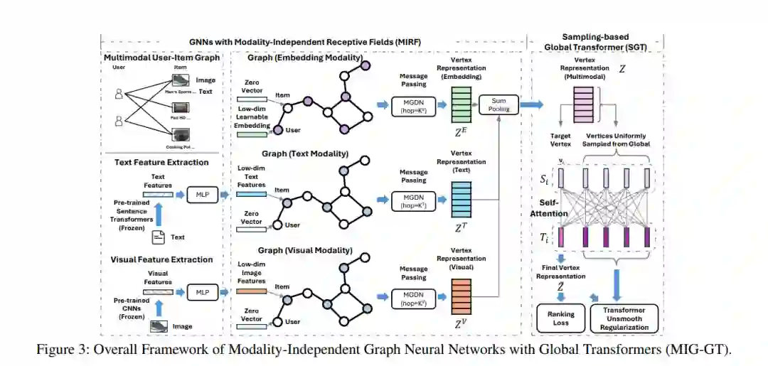 多模态推荐系统可以通过现有的用户-物品交互以及与物品相关的多模态数据的语义,来学习用户的偏好。许多现有方法通过多模态用户-物品图来建模这一过程,将多模态推荐视为图学习任务。图神经网络(GNNs)在这一领域展现了良好的性能。先前的研究利用了GNNs在特定感受野(通常由跳数K表示)内捕获邻域信息的能力,以丰富用户和物品的语义。我们观察到,GNNs的最佳感受野在不同模态之间可能有所不同。本文提出了具有模态无关感受野的GNNs,这些GNNs为不同模态采用独立的感受野,以提升性能。我们的结果表明,某些数据集上,某些模态的最佳K值可以低至1或2,这可能会限制GNNs捕获全局信息的能力。为了解决这个问题,我们引入了基于采样的全局变换器(Sampling-based Global Transformer),通过均匀全局采样来有效地将全局信息整合进GNNs。我们进行的全面实验表明,我们的方法优于现有方法。我们的代码已经公开。