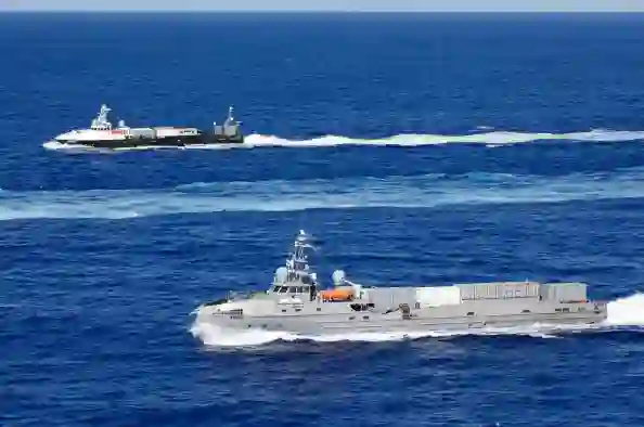 图:美海军无人水面舰艇(USV)Ranger与Mariner)驶过太平洋。
