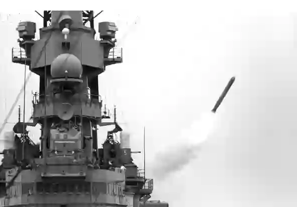 图:漠风暴行动开始时,一枚BGM-109战斧对地攻击导弹(TLAM)从密苏里号战列舰(BB-63)上向伊拉克目标发射。(美国国防部图片)