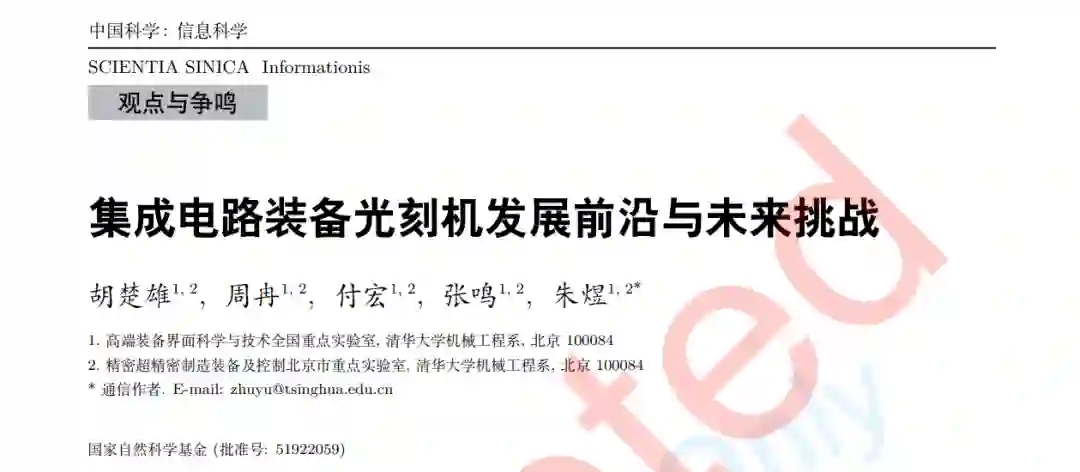 集成电路制造工艺主要是在半导体基底上通过氧化、光刻、扩散、离子注入等一系列工艺流程, 制作出晶体管、电容、电阻等元器件, 并将它们互相连起来的加工工艺, 而在整个集成电路制造过程 中, 光刻是最核心、最复杂的工艺步骤, 利用光学原理在硅片上转移电路图形, 决定了晶体管的最小 特征尺寸及密度. 从原始的硅片起到键合垫片的刻蚀和去光刻胶为止, 即使最简单的MOS 器件都需 要 5 道光刻工艺, 先进的芯片可能需要 30 道光刻工艺步骤 [2] . 在集成电路制造过程中, 光刻工艺的 费用约占制造成本的 1/3 左右, 耗费时间占比约为 40-50%. 光刻工艺所需的光刻机是最重要、最复 杂、最昂贵的集成电路制造装备, 其技术难度之大、单价之高在全球均属罕见, 被誉为“超精密尖端 装备的珠穆朗玛峰”, 挑战着人类超精密制造的精度和性能极限. 荷兰的 ASML 公司作为光刻机技 术的领头羊, 其光刻机的供应链横跨全球, 涵盖了 5000 家供应商. 这些供应商在光学、电磁学、材料 学、流体力学和化学等多个领域, 都提供了最前沿的研究成果. 如今, 光刻机不仅是推动整个信息时 代发展的重要力量, 更是产业基石和国家核心竞争力的体现. 集成电路装备, 尤其是光刻机的研制与发展, 对于一个国家的科技实力和产业竞争力有着深远的 战略意义. 一方面, 高端光刻机技术的掌握可减少芯片对外依赖, 增强自主创新能力和产业安全. 另 一方面, 光刻机技术的进步是推动半导体产业链上下游发展的关键, 可促进相关材料、设备、工艺等 领域的技术进步与产业升级. 因此, 本文将主要围绕光刻机发展前沿与未来挑战展开, 第 1 节简述集 成电路产业的重要性和光刻机在集成电路制造中的核心地位; 第 2 节简述光刻机的基本原理及其发 展脉络; 第 3 节介绍光刻机的关键技术和面临的主要挑战; 第 4 节介绍光刻机发展趋势及未来方向; 第 5 节进行总结与展望.