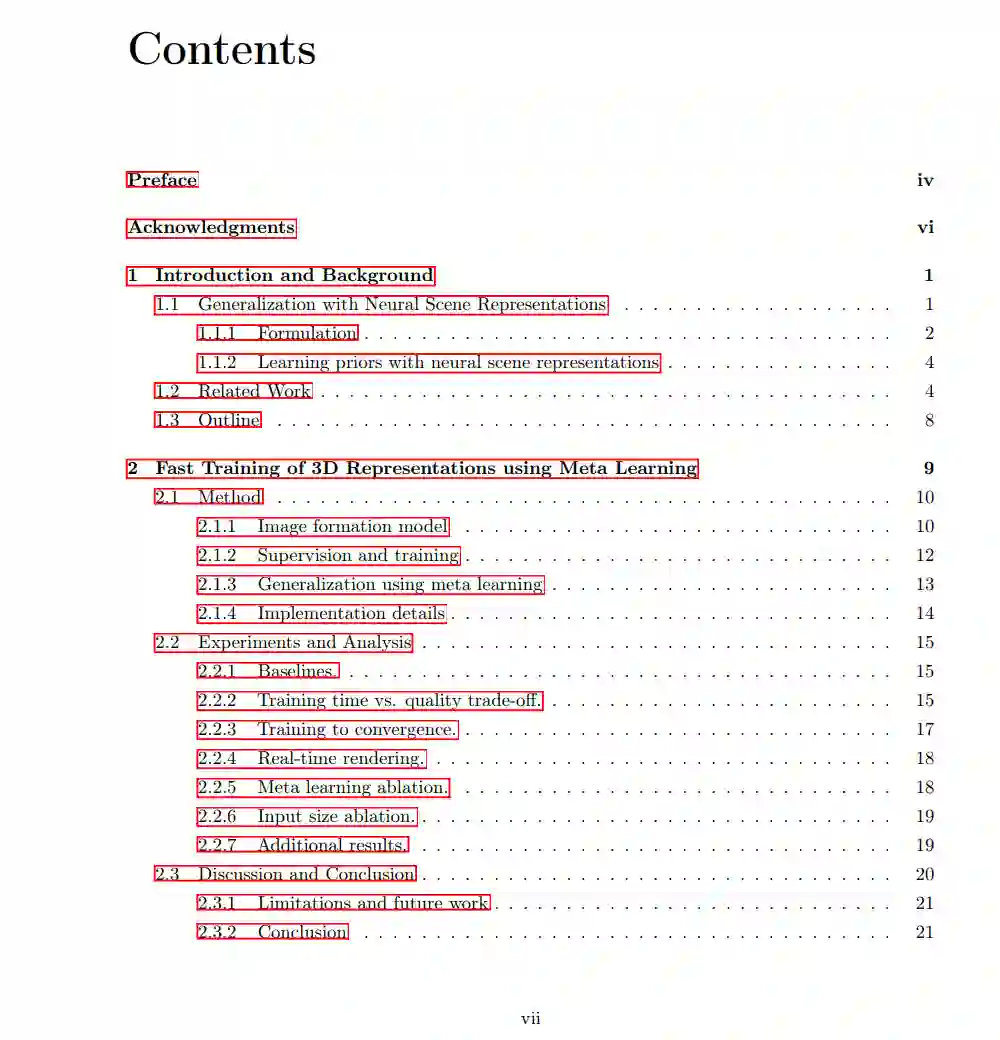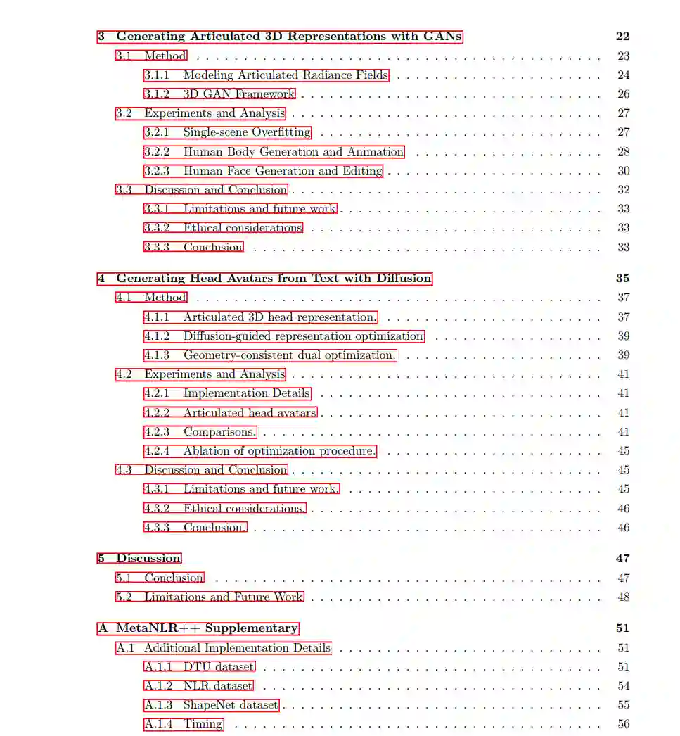 具体来说,在这篇论文中: • 我们展示了如何使用元学习从3D扫描和物体图像数据集中学习先验知识,以加速创建新物体的神经场景表示所需的优化。我们证明了使用元学习可以将从图像中的优化和神经场景表示的图像渲染时间从数小时缩短到几分钟。 • 我们提出了一个新的框架,使用生成对抗网络从仅有的2D图像集合中学习生成全新的人体和面部的3D表示。为了能够生成如人体这样的复杂物体类别,我们的方法提出了一个新颖的生成对抗网络架构,允许对生成的3D人体的身份和姿势进行独立控制。这允许对生成的3D人体进行可解释的控制。 •** 我们开发了一种方法,使用存储在2D扩散模型中的信息,仅根据文本提示创建可操作的人头的3D表示**。我们展示了使用我们的方法生成的3D资产与一个可变形的头部模型对齐,因此可以动画化面部表情和形状,与其他仅使用文本的3D资产生成方法不同。