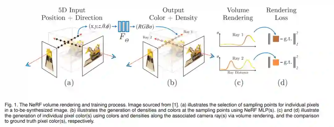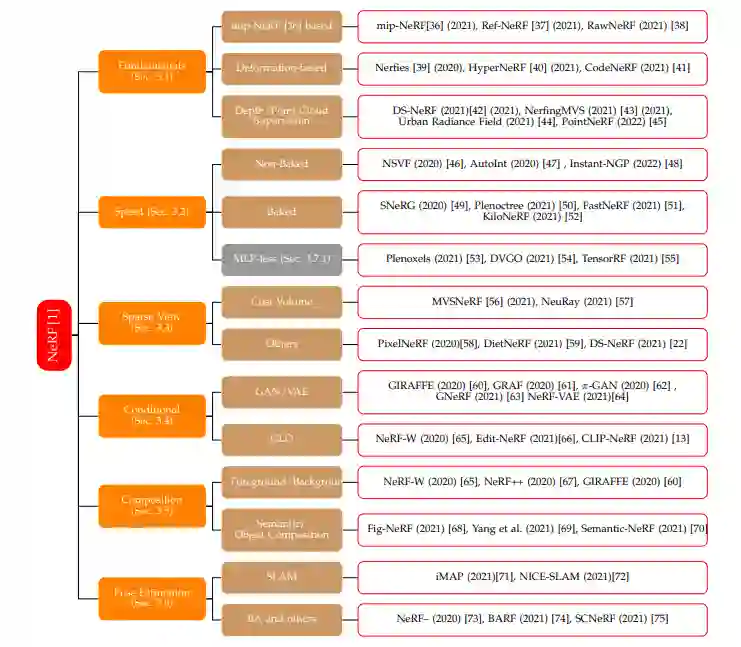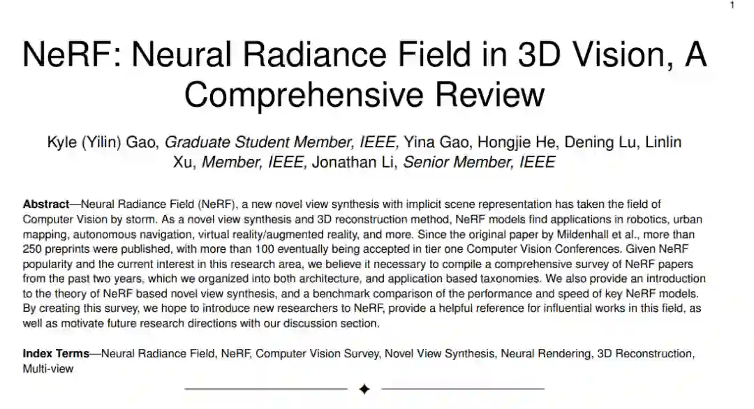 神经辐射场(Neural Radiance Field, NeRF)作为一种具有隐式场景表示的新型视场合成技术,在计算机视觉领域引起了广泛的关注。作为一种新颖的视图合成和三维重建方法,NeRF模型在机器人、城市地图、自主导航、虚拟现实/增强现实等领域都有广泛的应用。自Mildenhall等人的原始论文以来,已经发表了250多篇预印本,其中100多篇最终在一级计算机视觉会议上被接受。考虑到NeRF的流行和当前对该研究领域的兴趣,我们认为有必要对过去两年的NeRF论文进行全面的调查,我们将其分为体系结构和基于应用的分类。我们还介绍了基于NeRF的新视图合成理论,并对关键NeRF模型的性能和速度进行了基准比较。希望通过本次调研,为NeRF领域的新研究者提供有益的参考,同时也为未来的研究方向提供参考。 神经辐射场(NeRF)模型是一种利用多层感知器(MLPs)进行隐式神经场景体绘制的新型视图合成方法。在ECCV 2020年由Mildenhall等人[1]首次介绍,NeRF已经达到了最先进的视觉质量,产生了令人印象深刻的演示,并启发了许多后续的作品源自这种新颖的方法。在最近的过去(2022年),NeRF模型已经在照片编辑、3D表面提取、大型/城市规模的3D表示和视图合成中找到了应用。NeRF模型比其他新视图合成和场景表示方法有一些关键优势。